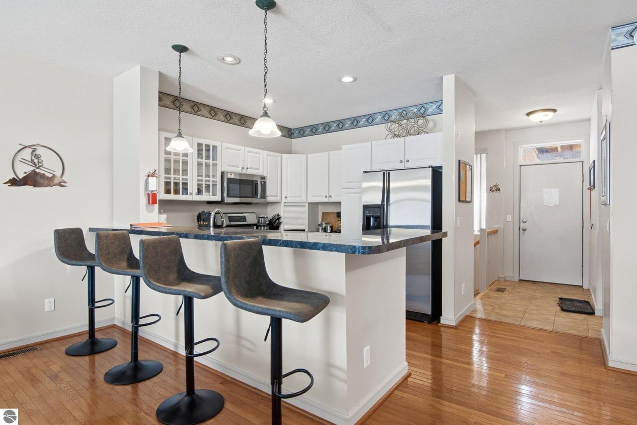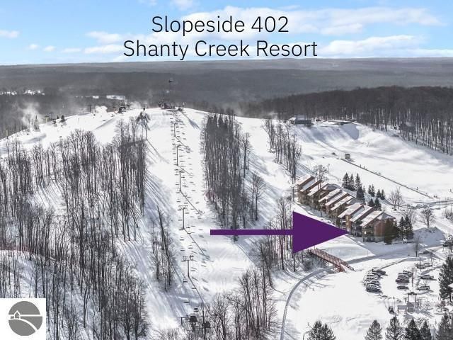 Not often available, a true ski-in/ski-out condo located at the base of Schuss Mountain's iconic Purple Daze lift. Slopeside 402 is a 3 bedroom, 3 bathroom condo in a prime spot, giving you easy access to the slopes including the opportunity to ski right up to your door. Inside you have 2 gas fireplaces, balcony with mountain view, in-condo jacuzzi tub, and abundant storage. Main level has free-flowing living space and there's generous gathering space on the walk out level too. Enjoy the Cedar River Lodge restaurant, heated all-season outdoor pool, beginner hill, golf course, and driving range outside your door. Well managed and friendly condo association. Connect to nature, family, friends, and adventure here at Shanty Creek Resort.