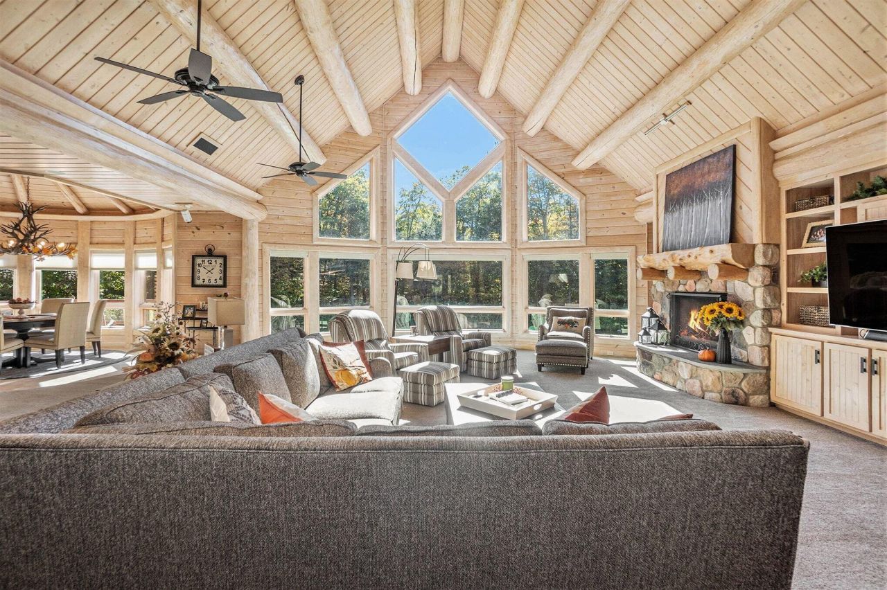 Featured on the cover of Log Home Design Ideas,this custom 8,000 sq. ft. White Cedar masterpieceblends rustic grandeur with modern luxury. Situatedon 40 acres of hardwoods and evergreens across fromLake Michigan, the estate features award-winninglandscaping with four waterfalls, a babbling brook, anda mile-long private trail for nature walks and skiing.The Residence The interior features light cedar logsand soaring vaulted ceilings. The Great Rooms 20-footwall of windows and massive stone fireplace create abreathtaking focal point. A gourmet kitchen boastsgranite counters, a walk-in pantry with a full-sizerefrigerator, and a radial breakfast bay with motorizedblinds. The Master Retreat offers a gas fireplace and aspa bath with a walk-in shower and dual-zone heating.A dedicated office wing includes two built-in desks,a computer room, and a private bath--perfect for ahome business.Entertainment & Amenities The upper guest wingfeatures three ensuite bedrooms and a common sitting area. The lower walk-out level is designed for hosting, complete with a large wet bar, game area, exercise room, and a solarium with a hot tub. Premium SystemsTechnology: Crestron-controlled theaters, Lutron lighting, and Ethernet throughout. Infrastructure: In-floor radiant heat (including the 6-stall drive-through garage), ERV clean-air system,and snow-melt entry. Storage: A 1,300 sq. ft. storage room plus extensive closet walls. Located 10 minutes from White Lake Yacht Club, this estate is the ultimate sanctuary for the discerning buyer. 3424 Scenic Drive, North Muskegon, MI 49445. BEDROOMS 5, SQUARE FEET 7,900, BATHROOMS 7