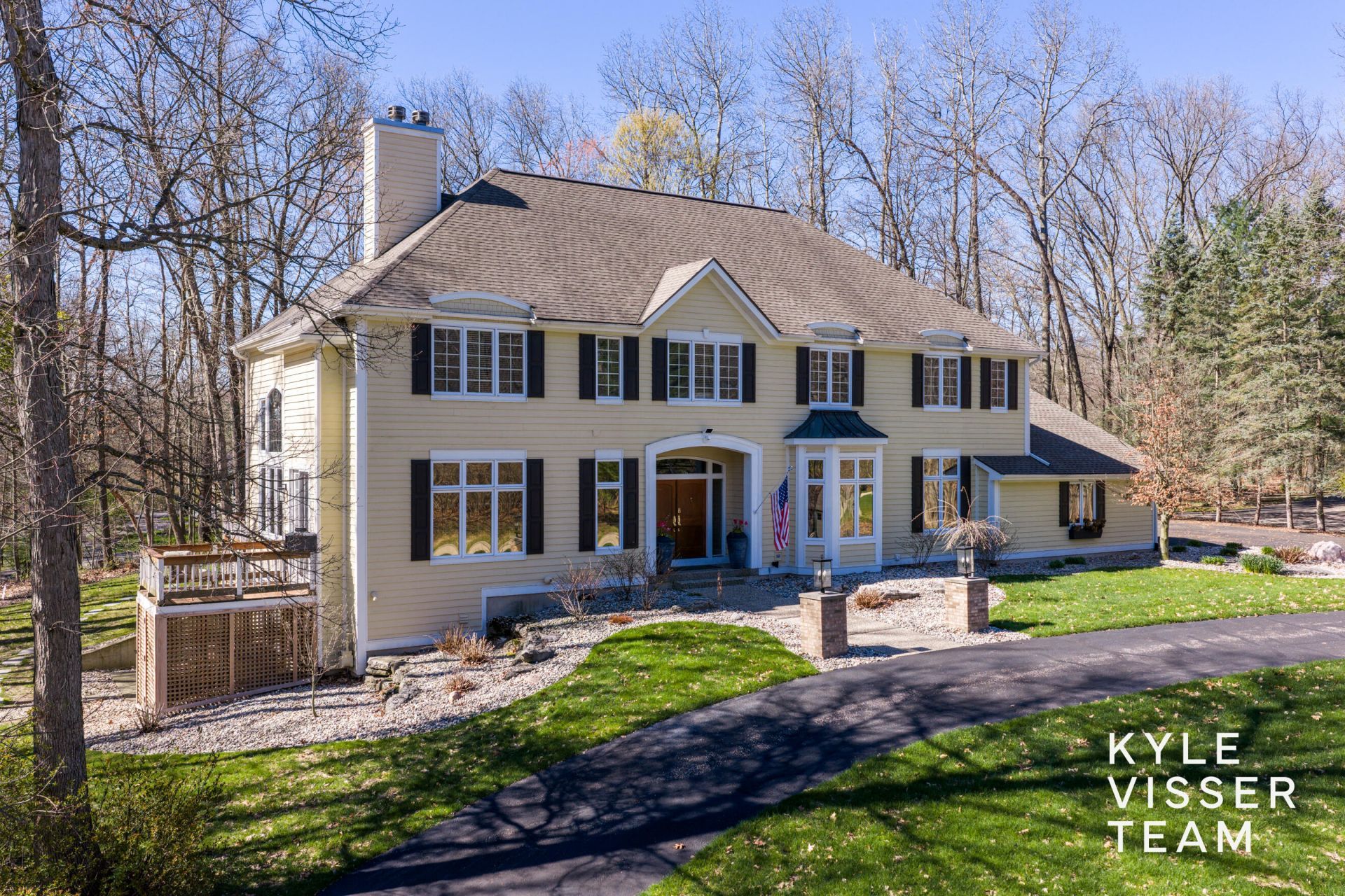 Expansive custom home in the gated Catamount community set on a private 1 acre wooded lot in Forest Hills Schools. This 4 bed, 3 full bath, 3 half bath residence is filled with natural light from soaring ceilings and expansive windows showcasing peaceful wooded views. Main level offers large living areas, including a sunroom surrounded by windows, private office/library with balcony, and an impressive kitchen with cherry cabinetry, granite surfaces, oversized island, and coffee bar. Primary suite features a private balcony, walk-in closet, heated marble shower, and soaking tub. Walkout lower level includes a recreation area with wet bar, wine storage, and room to expand. Enjoy a private backyard retreat with multiple decks and patios overlooking the woods, a lighted gazebo, fire pit, and beautifully landscaped spaces for relaxing.
