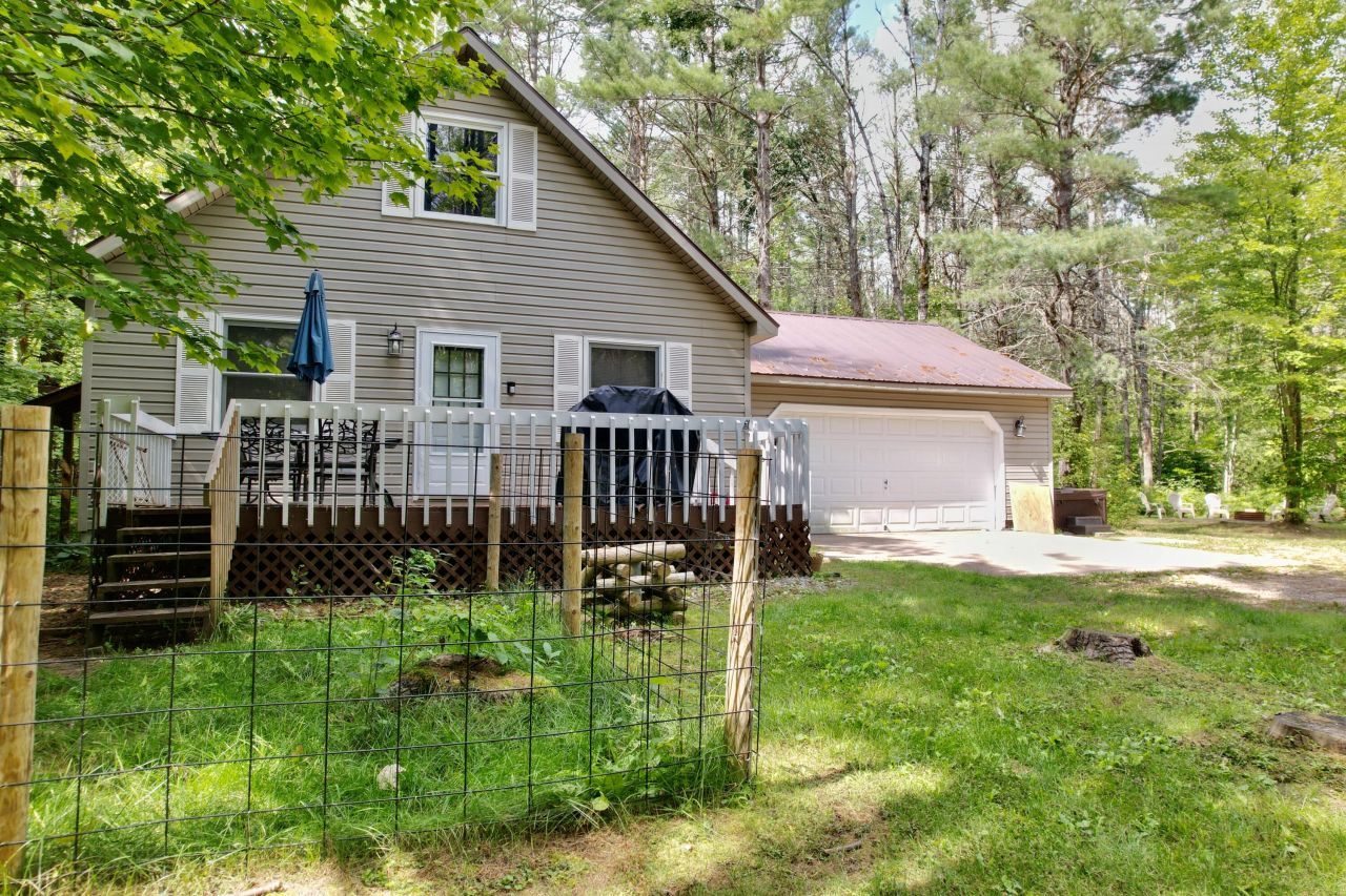 Charming 3-bedroom, 2-bath home in Lakes of the North! This beautifully maintained property features an open floor plan with a cozy gas fireplace, vinyl plank flooring, and tongue-and-groove knotty pine cathedral ceilings for that perfect Up North feel. Recent updates include a new furnace, new water softener, freshly refinished deck, and new bedroom paint. A durable metal roof, heated 2.5-car attached garage, and main-floor laundry add comfort and convenience. Enjoy the hot tub, fenced dog run, and spacious front deck overlooking a wooded lot with a circle driveway. Located in the desirable four-season community of Lakes of the North, offering trails, clubhouse, airport, indoor pool, golf, and more!