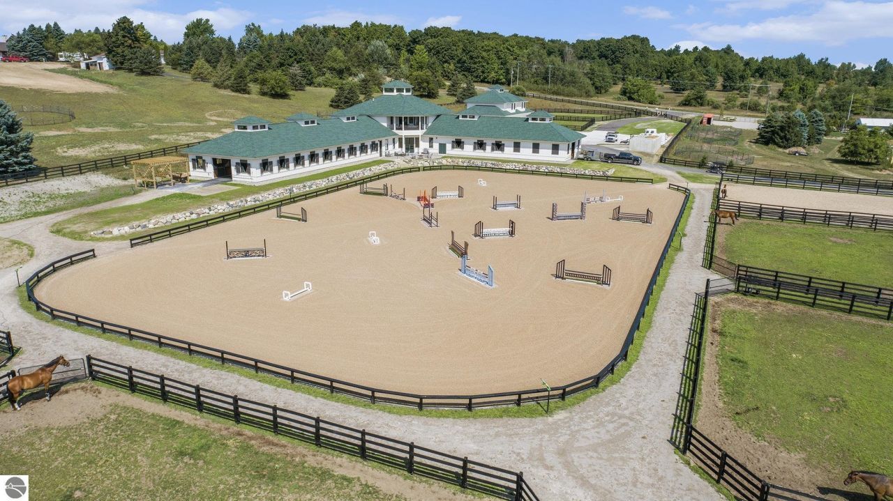 Pinecone Farm is a luxurious 6-acre gated equestrian estate located adjacent to Flintfields Horse Park, home of the Traverse City Horse Shows. Completed in 2024 with no expense spared, the property was nationally recognized in the Best in American Living Awards for Best Accessory Dwelling Unit???highlighting the exceptional quality and thoughtful design throughout. Designed by equestrians for functionality and comfort, the 11,875 sq ft main barn features 24 BarnWalker stalls with bamboo walls, stainless top rails, and individual water fillers. The stalls are divided into two wings, each with its own tack room and storage???ideal for private use or rental. The barn includes 4 wash stalls, 4 grooming stalls, custom cabinetry, a spacious viewing lounge with half bath, bar area, refrigerator, and covered porch. Additional amenities include a laundry/break room, integrated tack storage, and hay/feed rooms with exterior access. Above the main barn is a private 4-bedroom, 3.5-bath owner???s residence with a private elevator and dumbwaiter. Enjoy panoramic views over the riding ring and countryside from the primary suite and covered viewing deck. The auxiliary barn offers 4-bedroom, 2-bath staff accommodations, extra-height garage doors for RVs, a golf cart charging wall, and wiring for temporary stalls. Outside amenities include a 250???x150??? GeoFiber riding ring, GeoFiber longeing ring, irrigated paddocks with underground drainage, and 2 RV hookups. The property features two gated entrances from Brackett Road and Arabian Lane, plus an additional gate for horse and golf cart access to the showgrounds. This is a rare opportunity to own a turnkey, award-winning equestrian property in one of the country???s top show destinations.