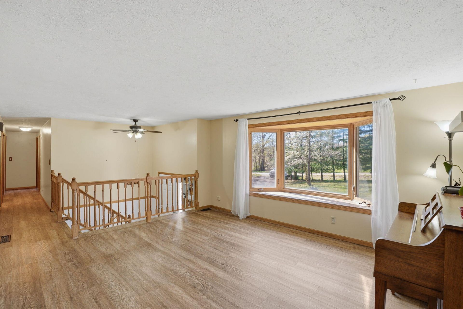 Welcome to this spacious 5-bedroom, 3 full bathroom home situated on just under 2 acres in Bellevue. This property offers multiple living areas, including a main living room featuring a rock wall fireplace and large windows that provide natural light and views of the backyard.Additional living space includes a family room with a bay window overlooking the front yard. The home also features large three-season rooms on both the upper and lower levels, offering additional space for a variety of uses.The property includes a 30x40 pole barn, offering versatile space for storage, equipment, or hobbies, along with acreage suitable for outdoor activities and other uses.