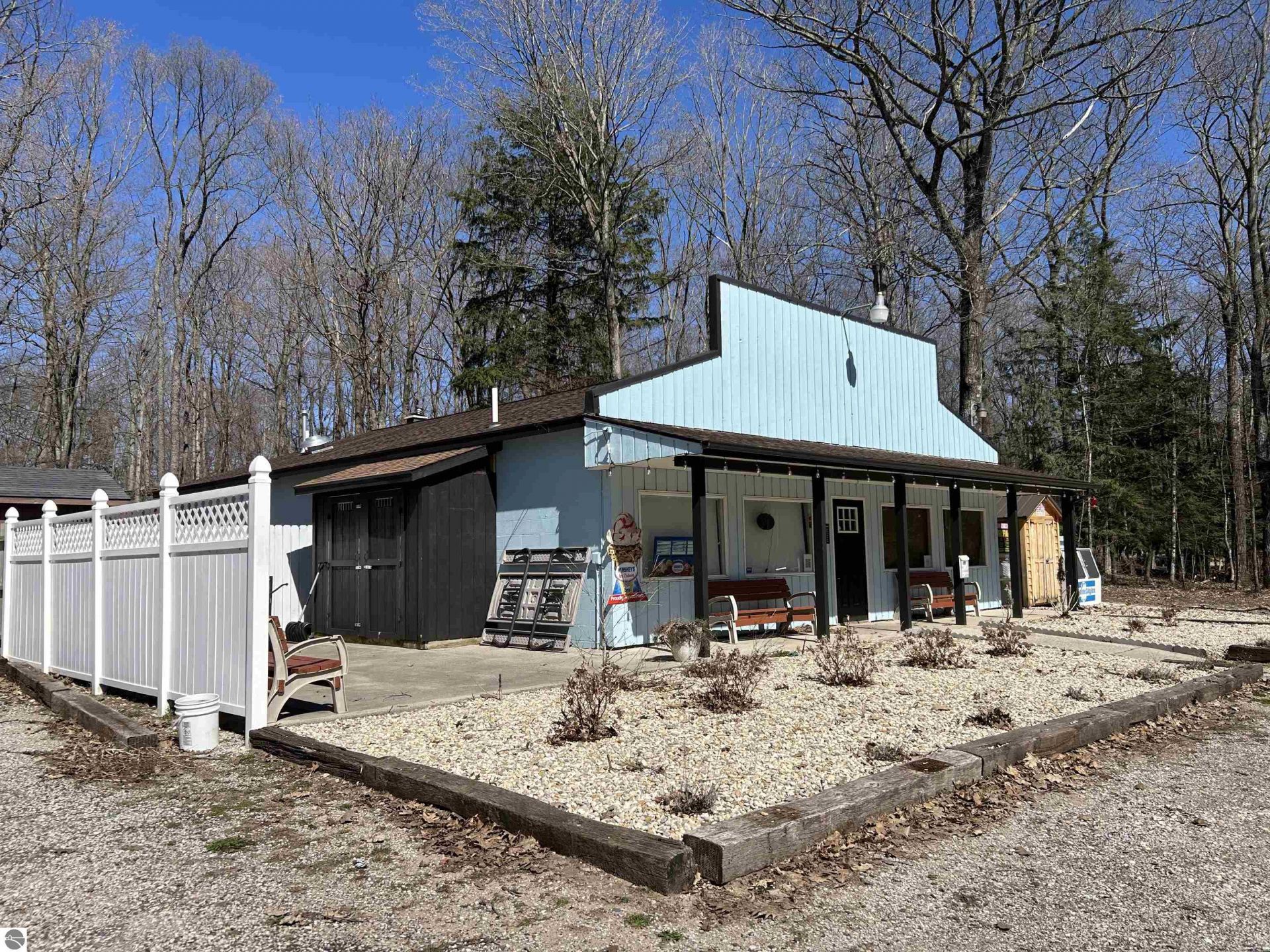 Income opportunity between the Platte lakes, west of Honor in Benzie County. Set your business sights on this 1800 Sq. Ft. building with commercial uses possible in a recreational paradise. Work diligently and reap the benefits of making a living in Cottage Country, near the Platte River, lakes and the Sleeping Bear Dunes National Lakeshore Park to the west along scenic, spectacular M-22. This half-acre site has been used as a convenience store and more recently as a deli. Many possibilities exist for this location, including take-out pizza and boxed lunches to go (pizza oven/deli equip. available), with a liquor license for carryout available to purchase. Add to your income with bicycle rentals (think touring bikes, fat-tire bikes or e-bikes). Or make this space into a specialty coffee shop and bakery, gift shop, convenience store, studio/gallery or combination of the above. The building is also available to Rent. There is ample parking and even room to upgrade the septic should you decide to live and work here. So much to offer in a great location with an Up North vibe.